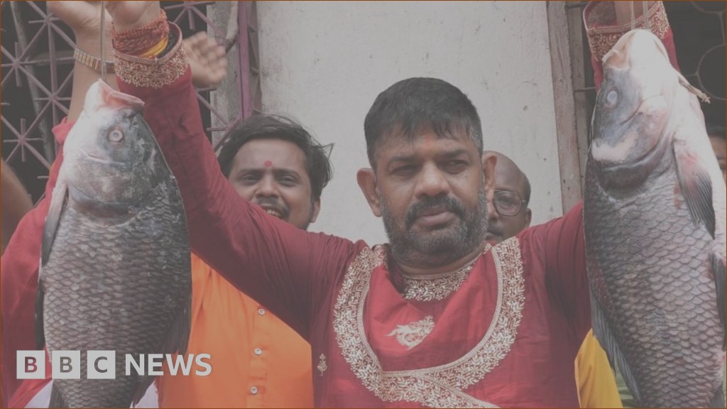 In Kolkata’s bustling port area, BJP candidate Rakesh Singh makes an eye-catching appearance as he prepares to challenge the city’s mayor, Firhad Hakim, in a highly watched election. Dressed to impress and accompanied by fellow party members, Singh grabs attention by holding up a fish as he walks through the morning crowds. This energetic display aims to rally support and make a memorable impression on voters in the busy metropolis.